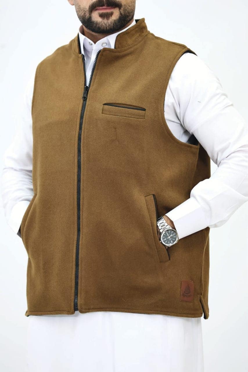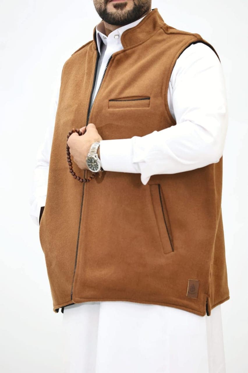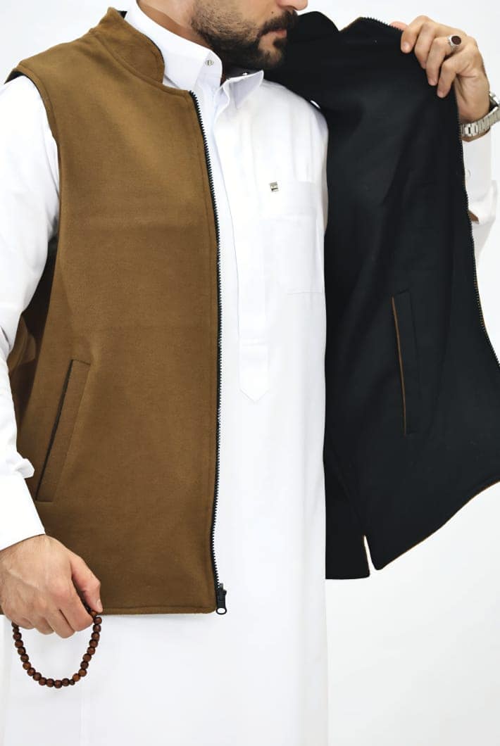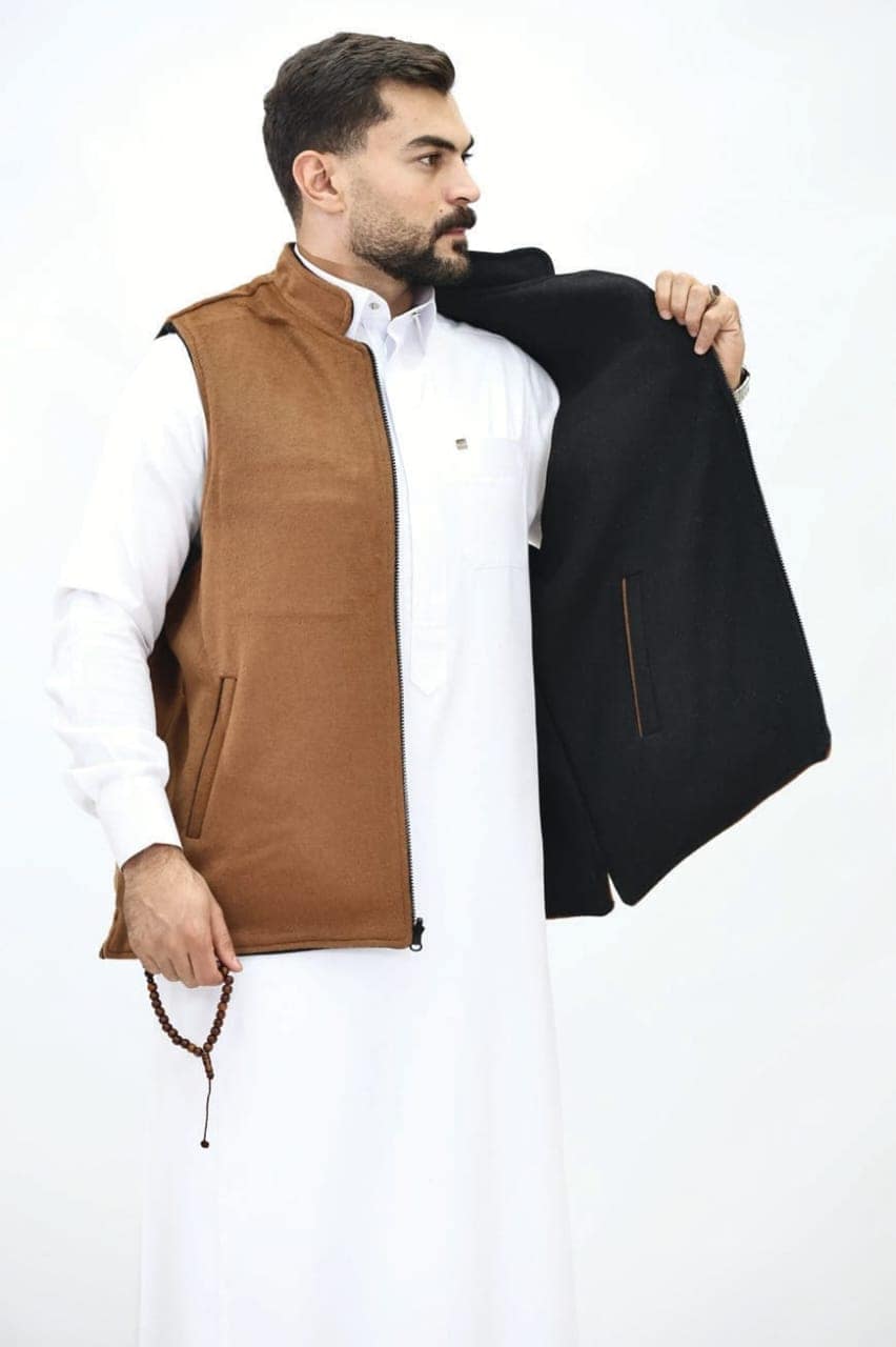 دفء وأناقة في قطعة واحدة! صداري رجالي بوجهين (بني شتوي دافئ / أسود كلاسيكي) بسحاب كامل وجيوب جانبية. مثالي للإطلالات التقليدية والرسمية مع الثوب. قطعة أساسية لموسم الشتاء.
