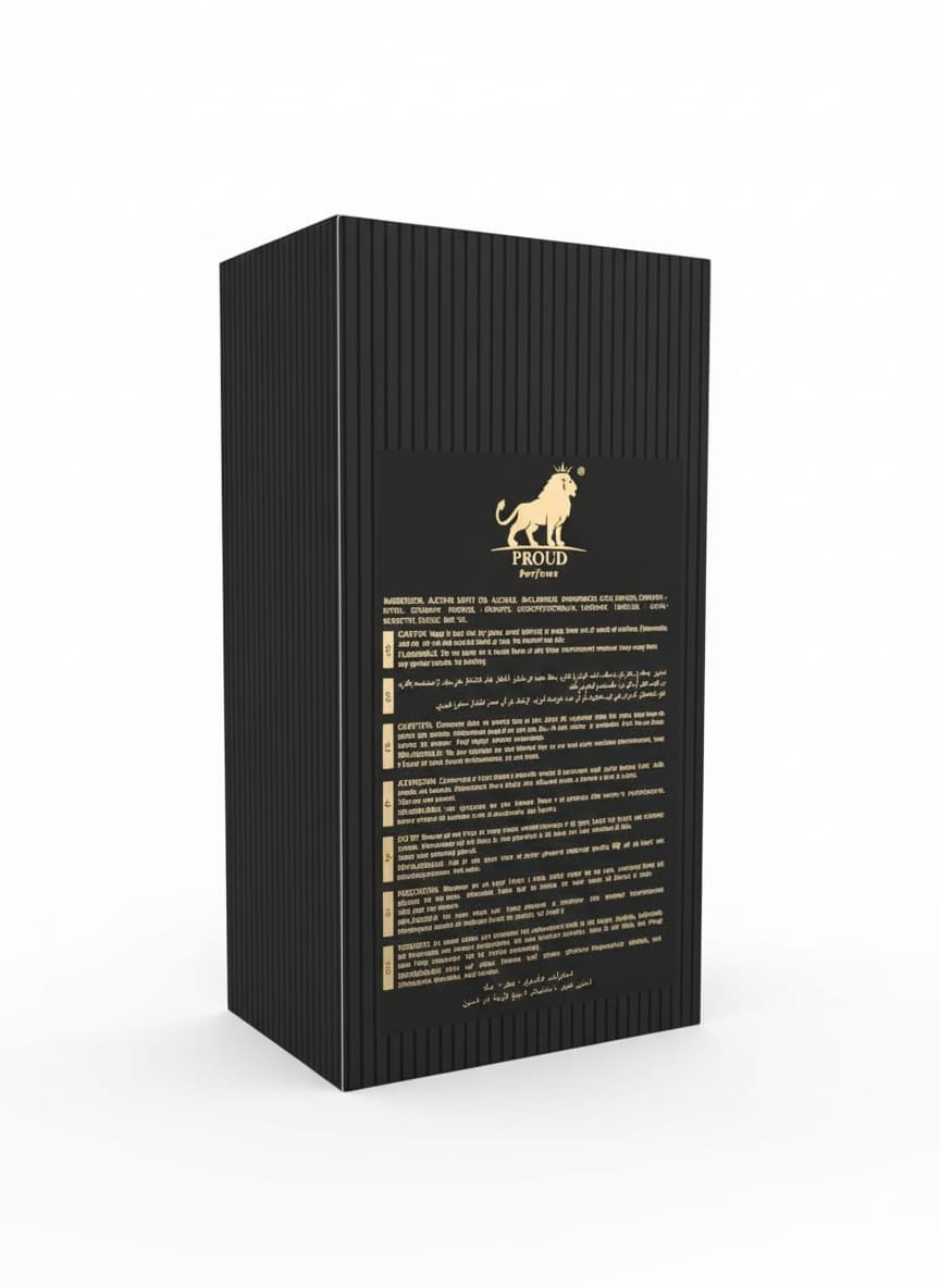 العلامة التجارية “Proud Perfumes” وشعار الأسد يضيفان لمسة من الفخامة والقوة لهوية العطر.