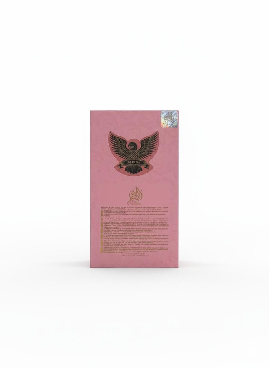 تأتي الزجاجة بلون وردي غني وجذاب، تعكس مزيجًا من الرقة والجرأة. يتوج الزجاجة غطاء فخم على شكل صقر ذهبي بأجنحة مفتوحة، يرمز إلى الحرية، القوة، والتحليق نحو القمم. العبوة الخارجية الوردية مزينة بنقوش ذهبية مع شعار الصقر، مما يجعلها قطعة فنية بحد ذاتها ومثالية للإهداء.