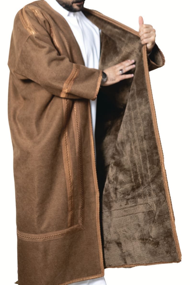 تُظهر الفروة تصميمًا عربيًا تقليديًا غنيًا يجمع بين الفخامة والدفء، وهي مثالية لأجواء الشتاء الباردة. تتميز بألوانها الخارجية الدافئة الأسود والبني والعسلي، مما يمنحها مظهرًا كلاسيكيًا وأنيقًا. القصة واسعة وفضفاضة، تذكرنا بالبشت التقليدي، مما يتيح ارتداءها فوق الملابس الأخرى بسهولة وراحة، يزين الفروة شريط زخرفي عريض ومتواصل على طول الحواف الأمامية المفتوحة، ، وعلى أطراف الأكمام. هذا الشريط يتميز بنقوش هندسية دقيقة ومتكررة مما يخلق تباينًا جميلًا مع لون القماش الأساسي ويضيف لمسة من الأصالة والحرفية التراثية. الأكمام عريضة وتوفر مساحة للحركة، وتُبرز التطريزات الفاخرة على حوافها. التصميم العام يعكس رقيًا وهيبة، مع تركيز على التفاصيل التي تعزز قيمتها الجمالية والتاريخية.