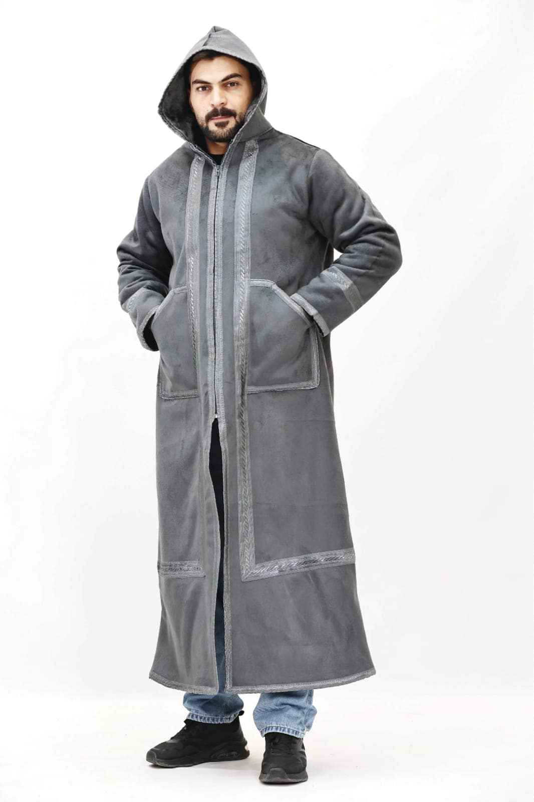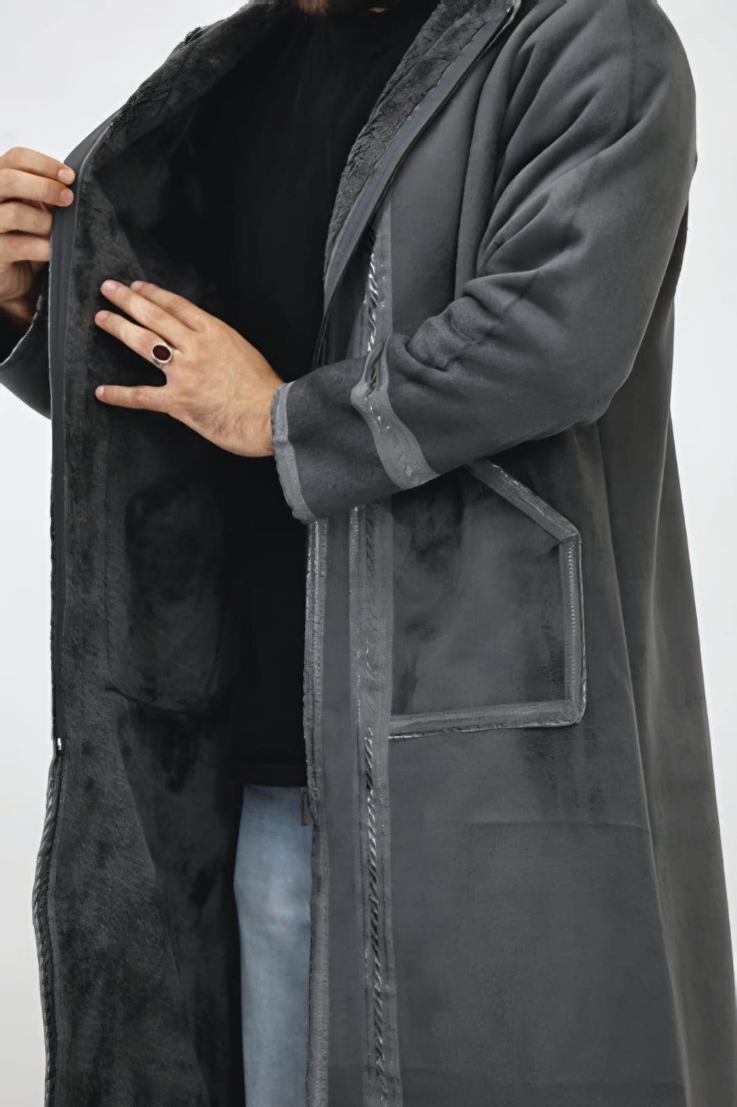 تتميز هذه الفروة بتصميمها الكلاسيكي الأنيق، الذي يُعد رمزاً للهيبة والوقار ينسدل القماش بسلاسة وجمال، مانحًا إياك مظهراً ملكياً لا مثيل له. ما يميز هذا الفروة حقاً هو التطريز اليدوي الفاخر الذي يزين أطرافه وحوافه بدقة متناهية وصنعها من قماش الشامواه. هذه النقوش ليست مجرد زينة، بل هي فن يحكي قصة الأصالة العربية، مُنجزة بحرفية يدوية تظهر كل تفصيلة صغيرة، مضفية عليه لمسة من الرقي والأصالة التي تليق بكبار الشخصيات.
