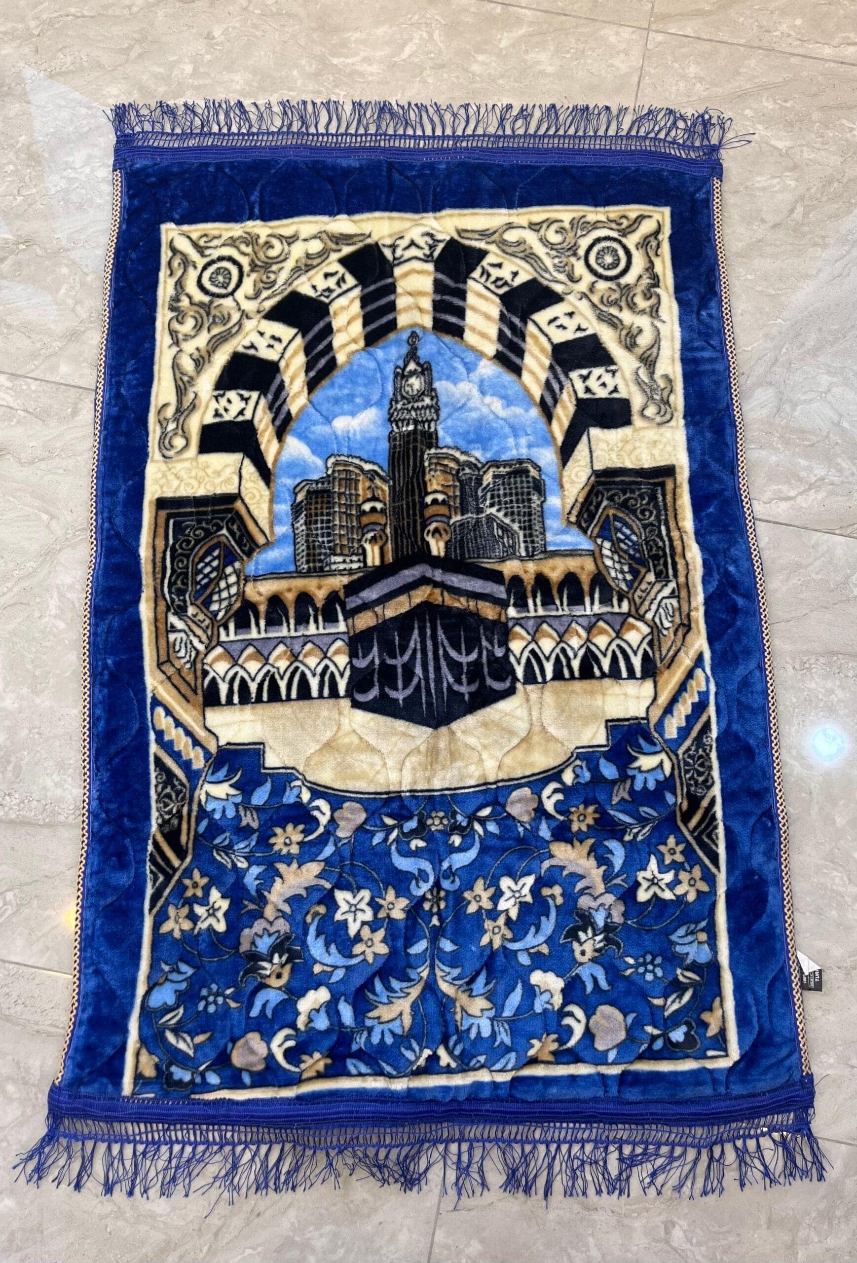 سجادة صلاة فاخرة بتصميم مميز للكعبة المشرفة. مصنوعة من خامة مخملية ناعمة ذات نقوش دقيقة وألوان زاهية تضفي سكينة وجمالًا على صلاتك. مبطنة بشكل مريح