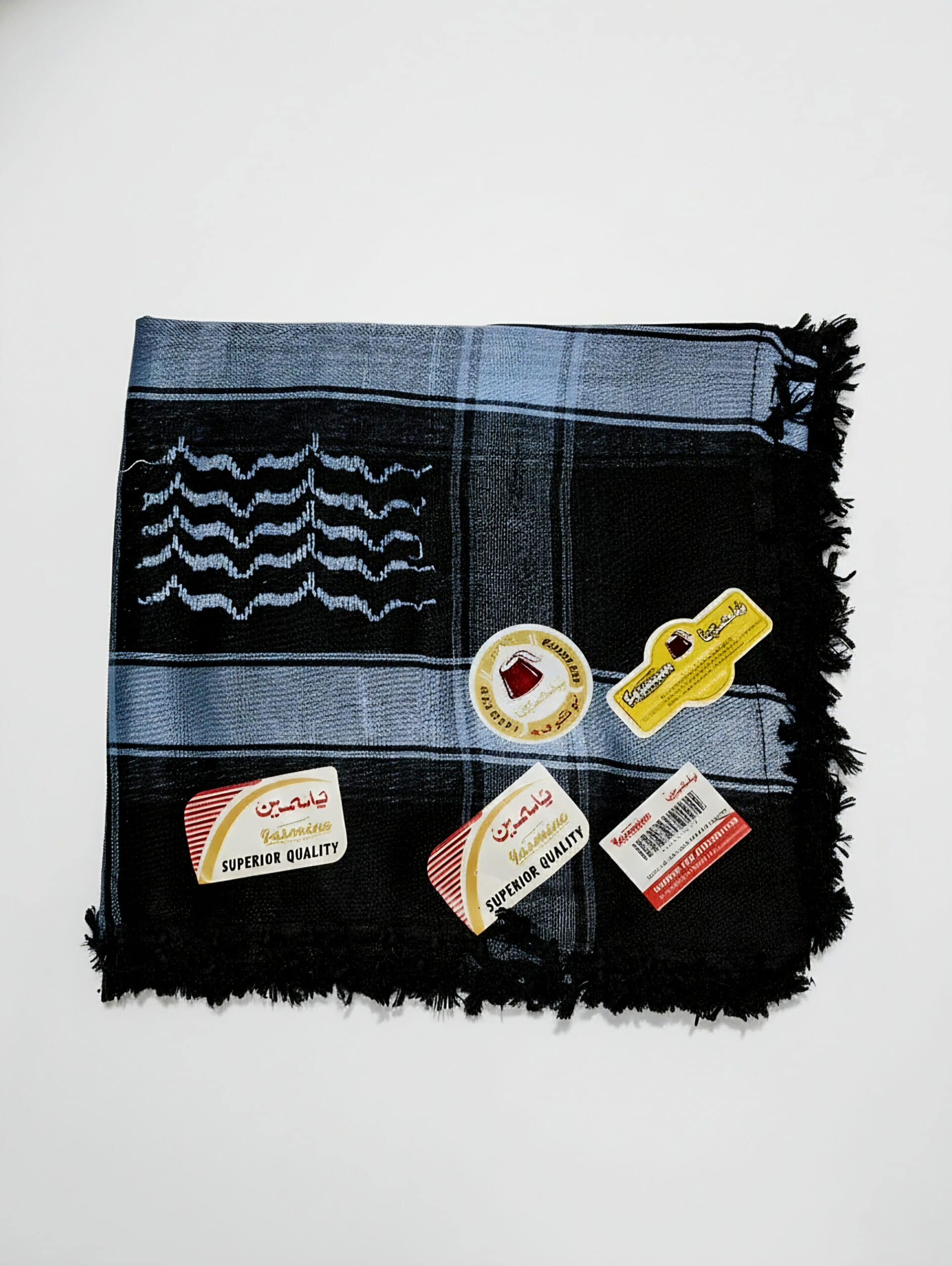 النقشة (الحياكة): يتميز الشال بنقشة مربعة أو شبكية تقليدية في خلفية القماش، تتخللها أشرطة من اللون الكحلي. أما الجزء الداخلي، فيحتوي على نقوش متموجة زخارف متعرجة باللون الأزرق الفاتح على خلفية سوداء، وهي تفاصيل تضفي طابعًا تقليديًا مميزًا.