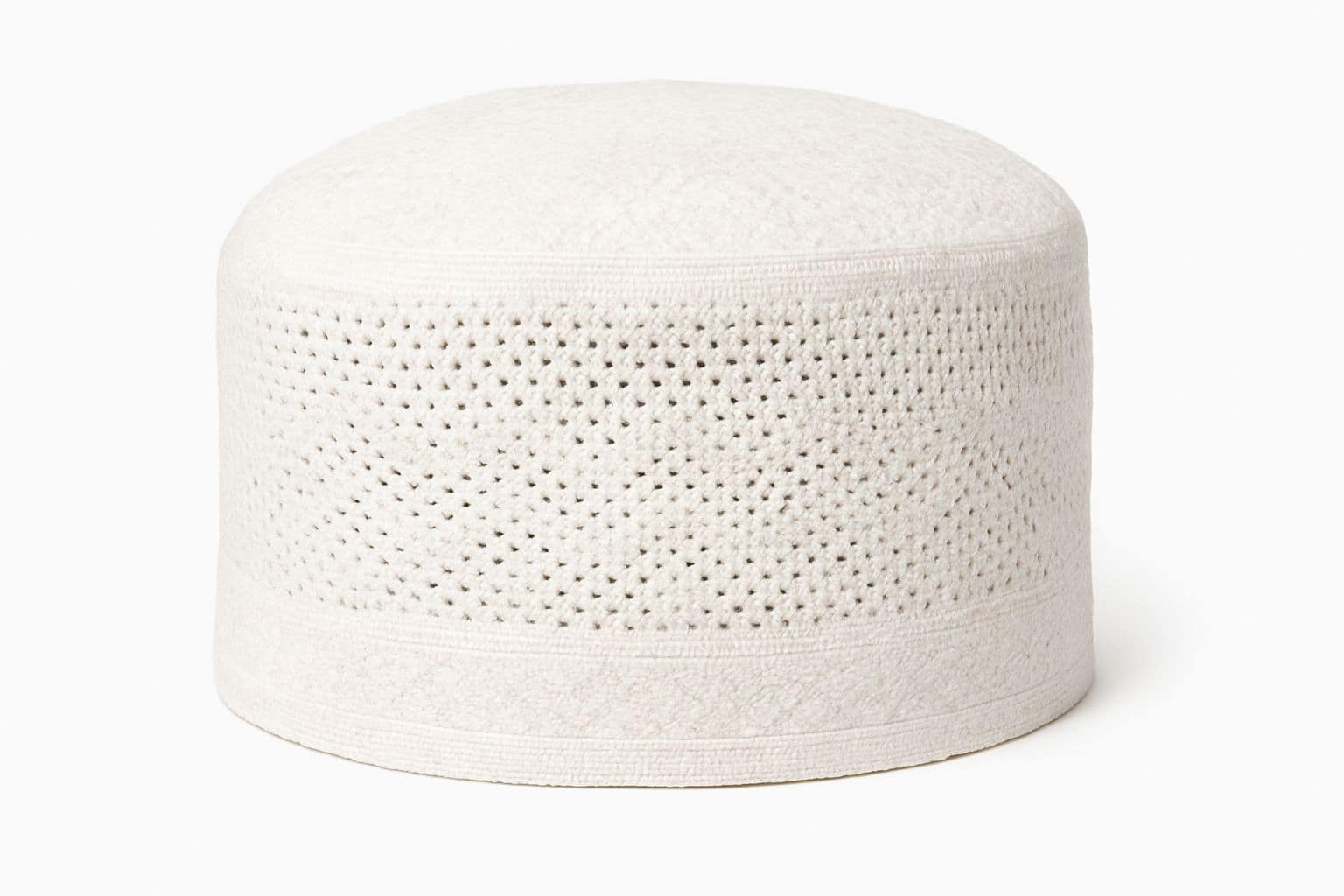 قبعة بيضاء فاتحة اللون، ذات مظهر تقليدي وإسلامي مميز. هذه القبعة، التي غالبًا ما تُعرف باسم الطاقية أو الكوفية في سياقات مختلفة، مصممة بشكل أسطواني قصير ومُدبب قليلاً عند القمة، مما يمنحها شكلاً متماسكًا ومستقرًا.