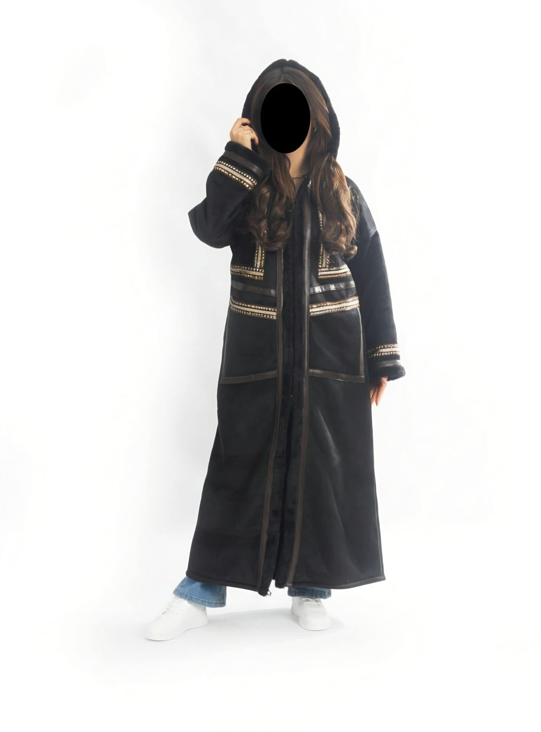 الإضافات: جيوب جانبية دافئة، سحاب أمامي مخفي (أو مفتوحة حسب الرغبة)، وتطريز قصب ذهبي/فضي متقن.