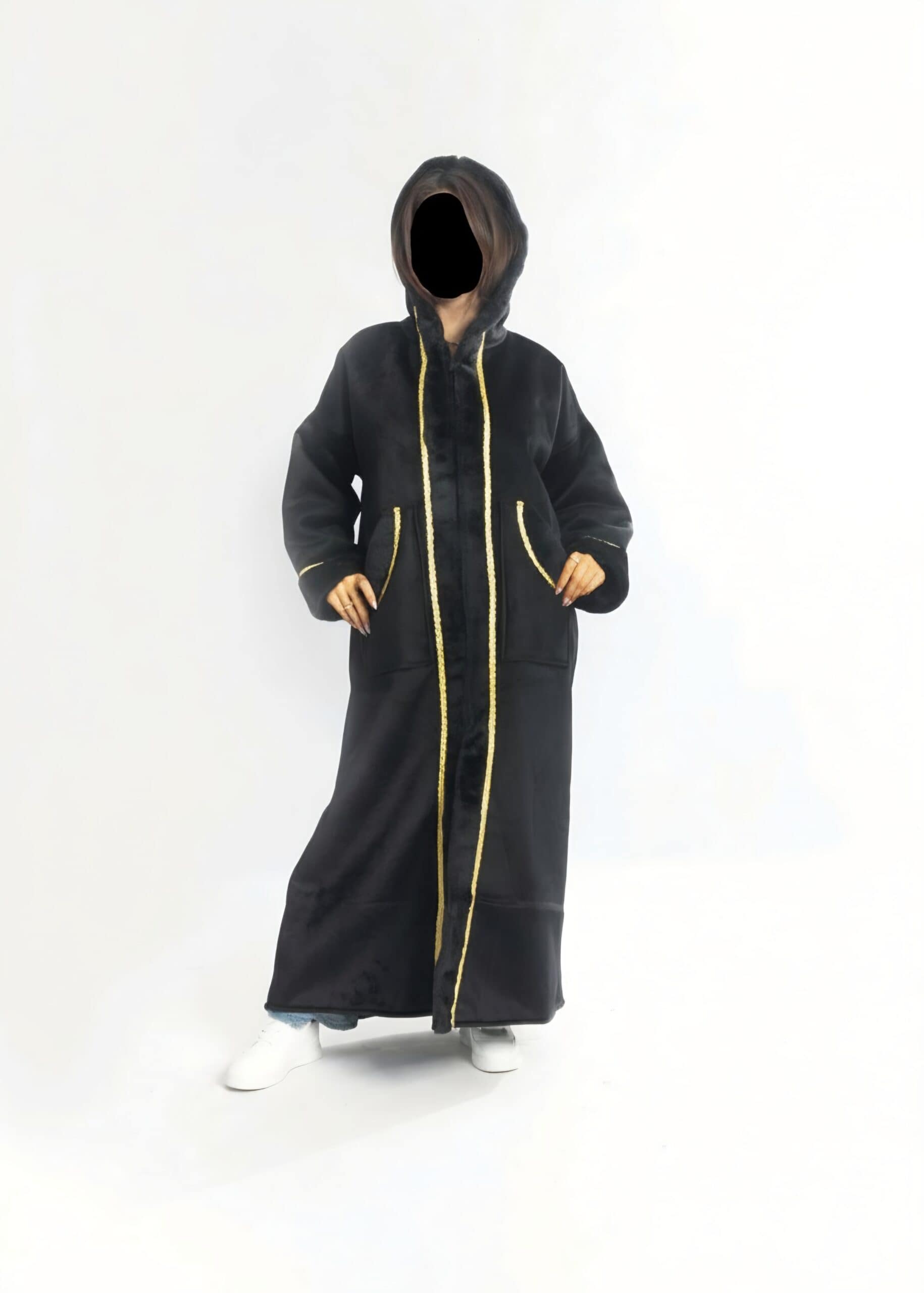 تفاصيل ذهبية أنيقة: تتميز الفروة بتطريزات قصب ذهبية دقيقة تحدد الأطراف والجيوب، مما يضفي لمسة من الفخامة والتميز على إطلالتكِ.