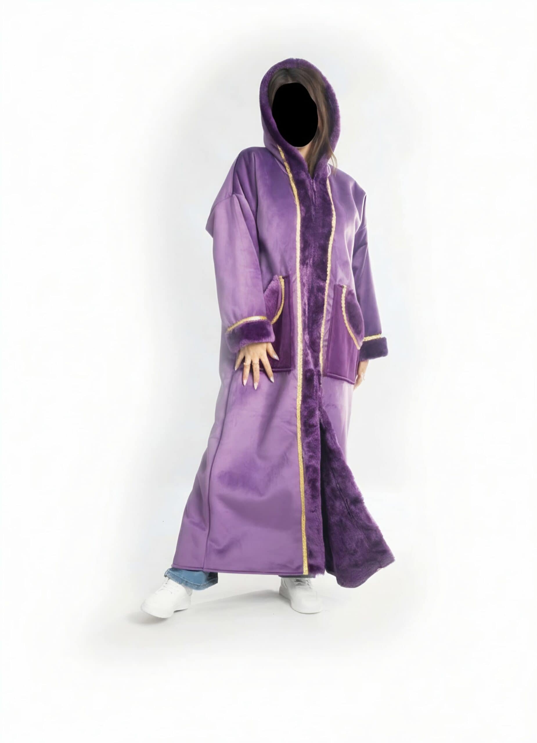 العناية: يُفضل الغسيل الجاف (Dry Clean) للحفاظ على جودة الفرو ونعومة القماش ولمعان التطريز الذهبي لسنوات طويلة.