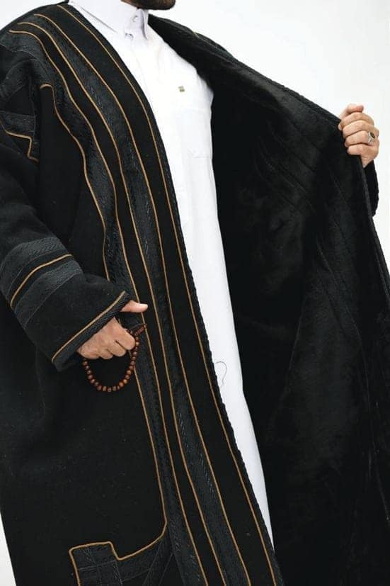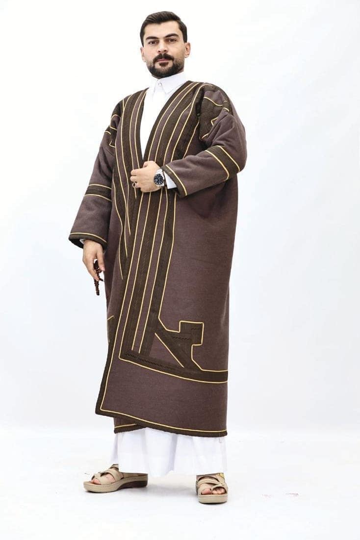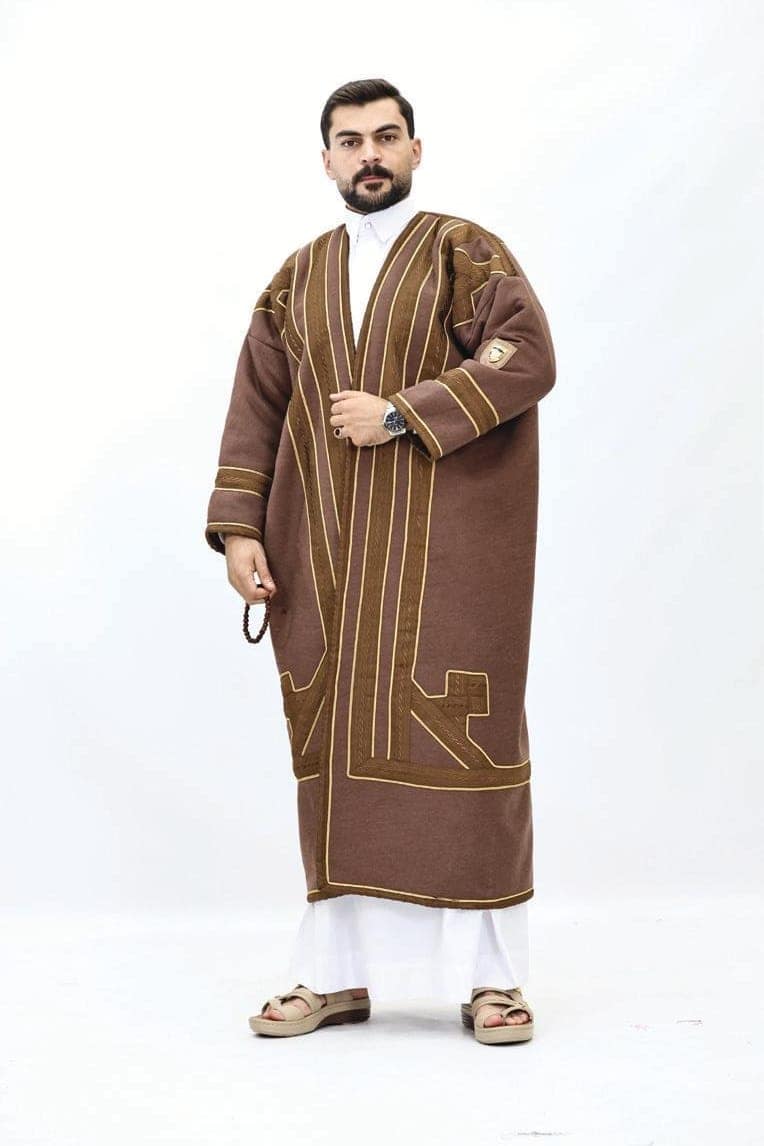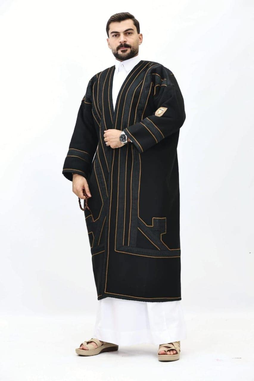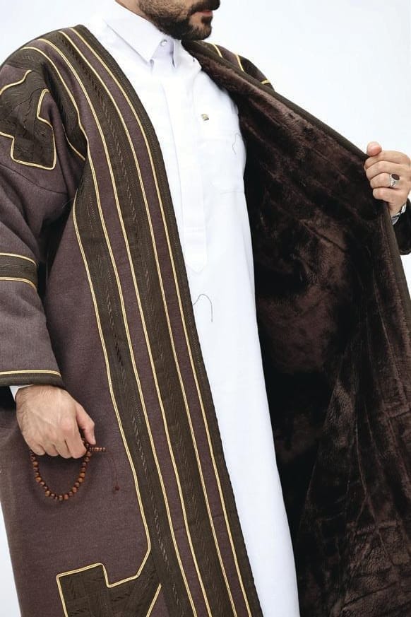 تُظهر الفروة تصميمًا عربيًا تقليديًا غنيًا يجمع بين الفخامة والدفء، وهي مثالية لأجواء الشتاء الباردة. تتميز بألوانها الخارجية الدافئة الأسود والبني والعسلي، مما يمنحها مظهرًا كلاسيكيًا وأنيقًا. القصة واسعة وفضفاضة، تذكرنا بالبشت التقليدي، مما يتيح ارتداءها فوق الملابس الأخرى بسهولة وراحة. يزين الفروة شريط زخرفي عريض ومتواصل على طول الحواف الأمامية المفتوحة، حول الرقبة، وعلى أطراف الأكمام. هذا الشريط يتميز بنقوش هندسية دقيقة ومتكررة مما يخلق تباينًا جميلًا مع لون القماش الأساسي ويضيف لمسة من الأصالة والحرفية التراثية. الأكمام عريضة وتوفر مساحة للحركة، وتُبرز التطريزات الفاخرة على حوافها. التصميم العام يعكس رقيًا وهيبة، مع تركيز على التفاصيل التي تعزز قيمتها الجمالية والتاريخية.