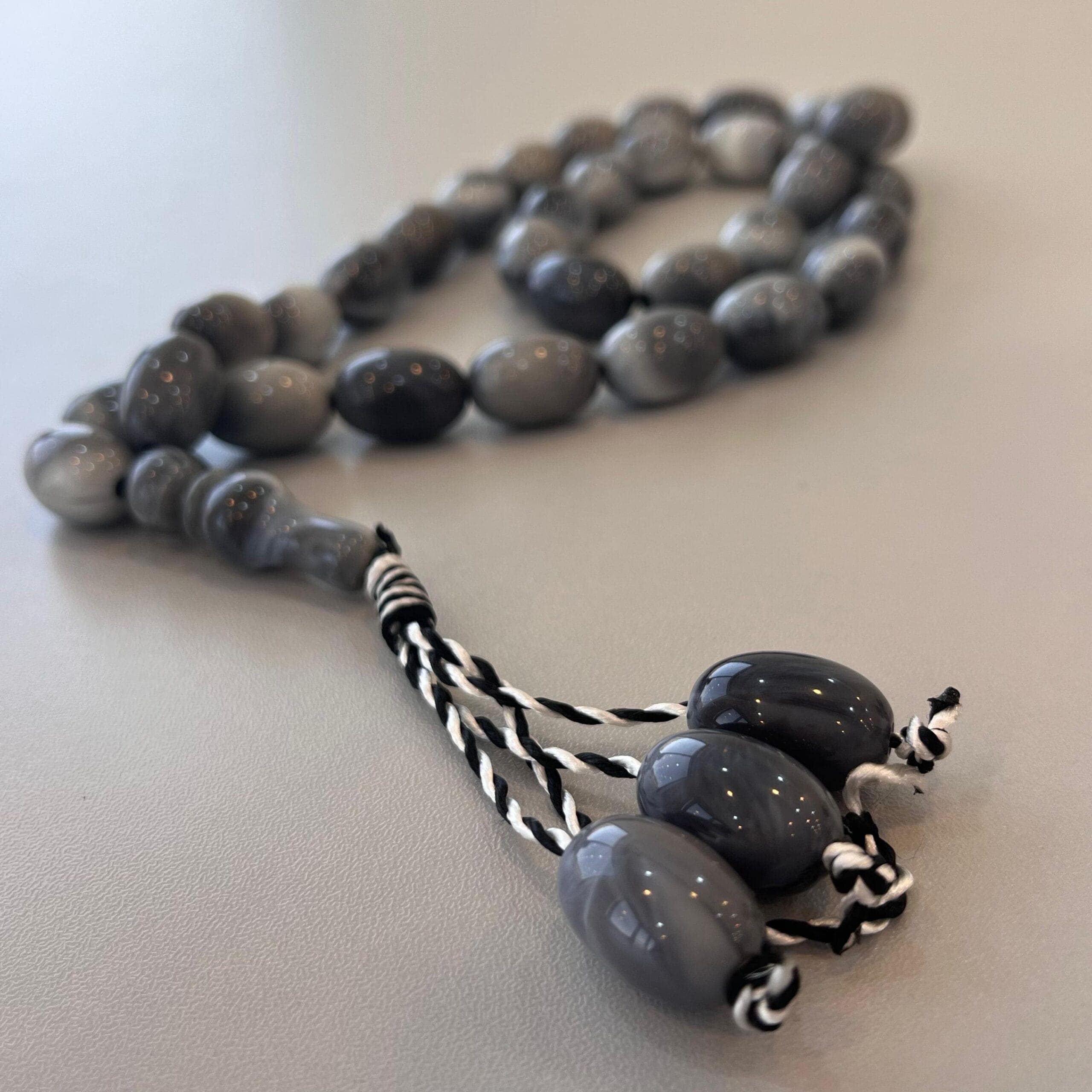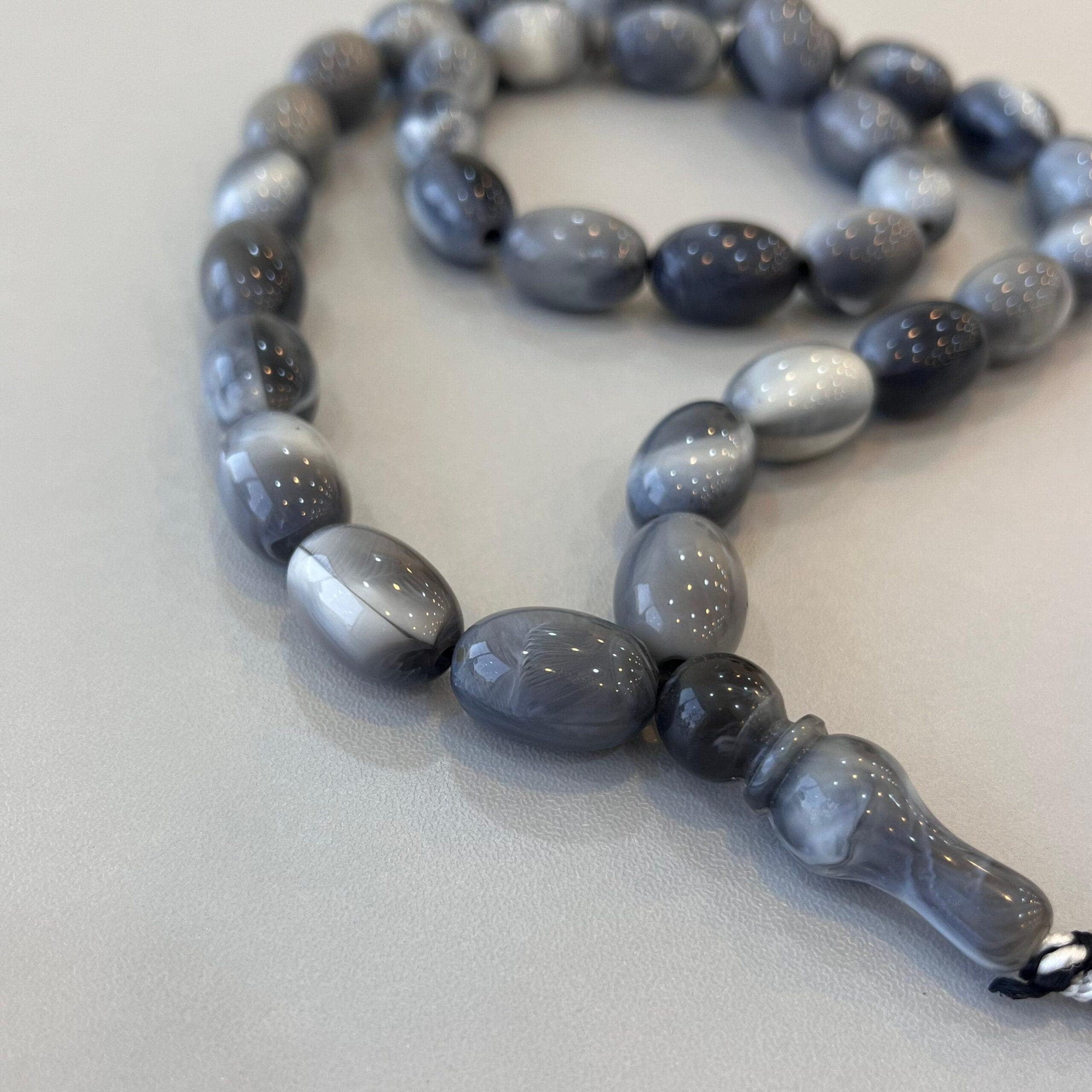 مسبحة مصنوعة يدويًا من حبات عقيق صناعي بيضاوي الشكل بلون رمادي متدرج يضفي لمسة من الأناقة والهدوء. عدد الحبات 33، وهو العدد المثالي للتسبيح اليومي أو كهديّة مميزة لمن تحب.