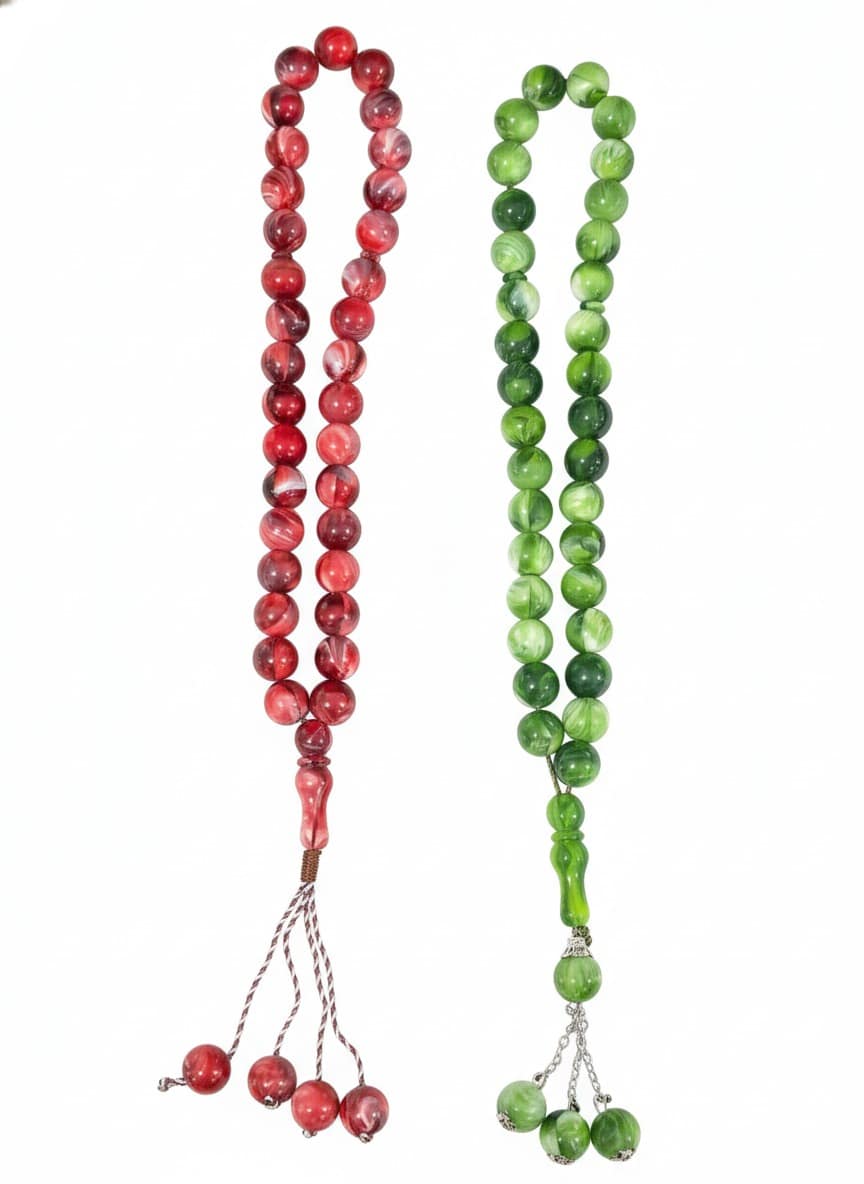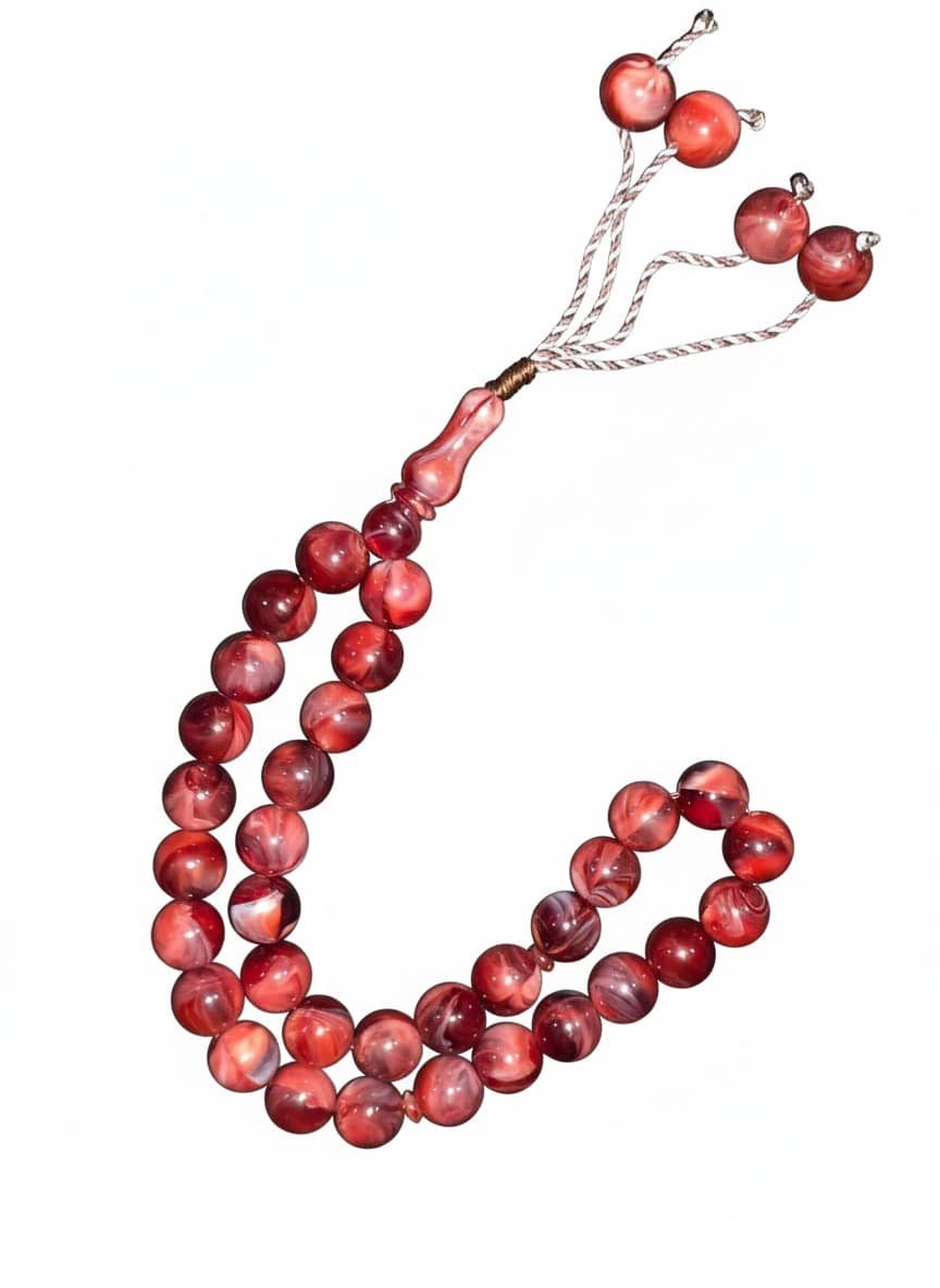 اللون الأحمر العنابي (الكرزي): يمتزج فيه اللون الأحمر الداكن مع تموجات بيضاء حليبية، مما يمنحها مظهراً دافئاً وجذاباً، ومزودة بكركوشة (شرابة) من الخيوط المتينة المجدولة بنفس لون الخرز لأناقة كلاسيكية.
