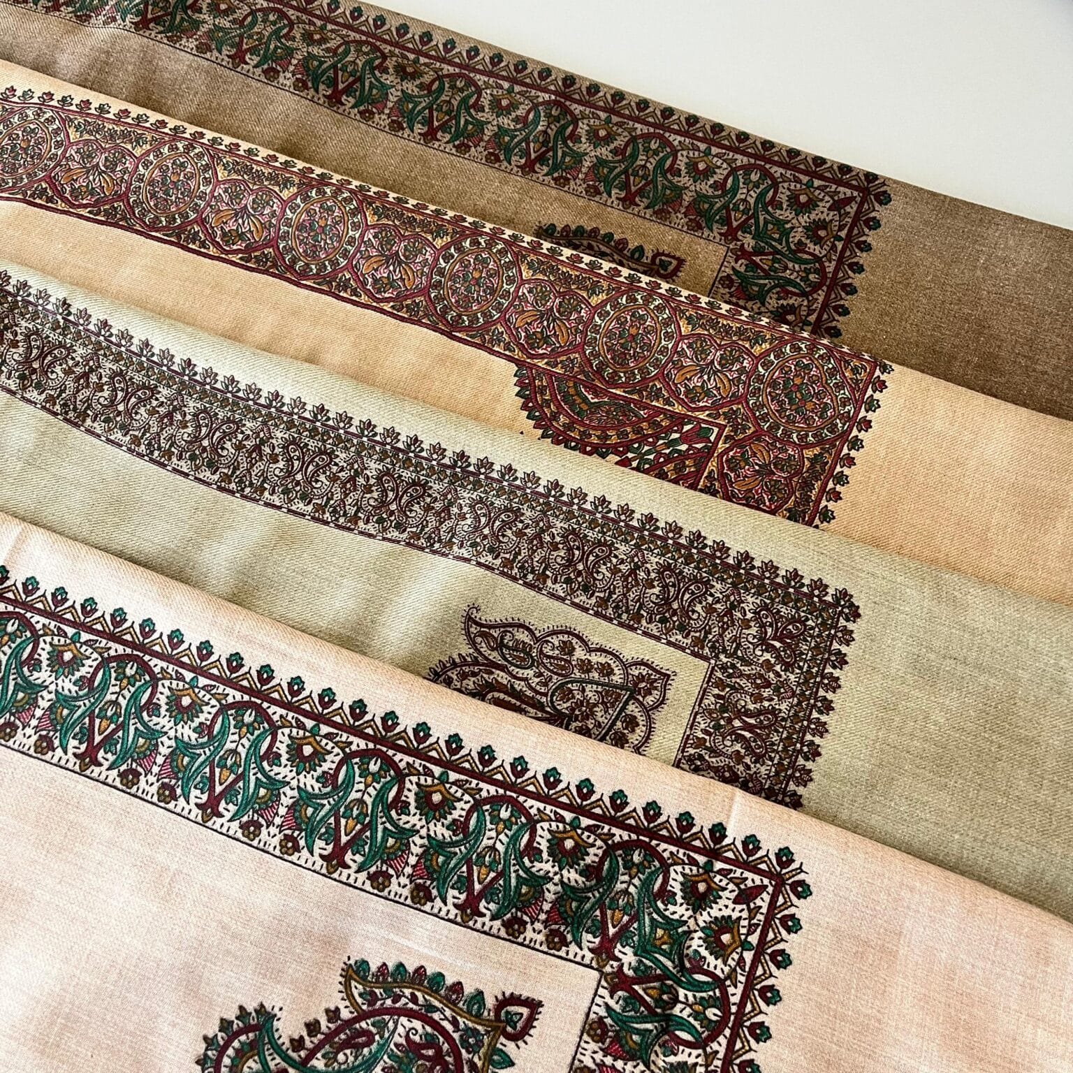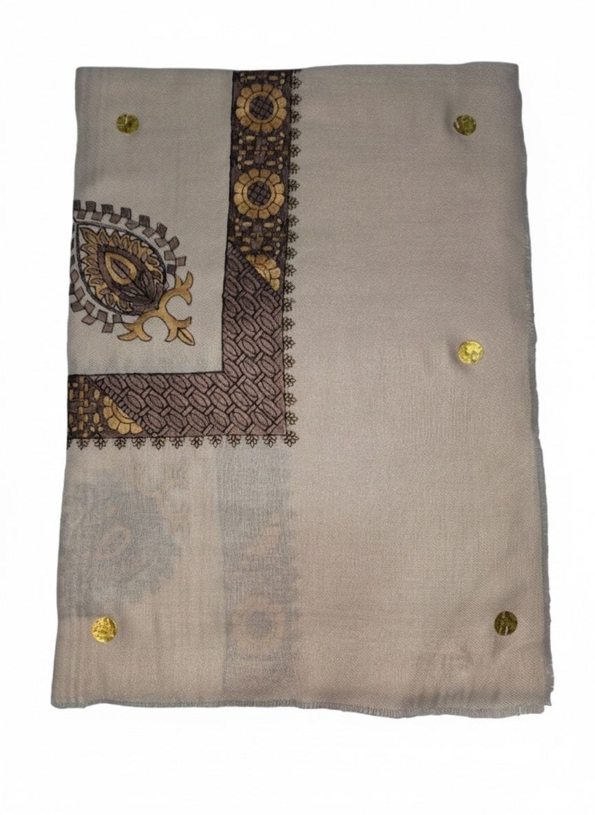 موقع التطريز: غالباً ما يتركز التطريز على أطراف الشال وحوافه، مشكلاً إطاراً زخرفياً غنياً يحدد القطعة ويبرز جمال نسيج الكشمير في المنتصف. في بعض الأحيان، يمتد التطريز ليغطي أجزاء واسعة من الشال في تصميمات “ملكية” أو معقدة.