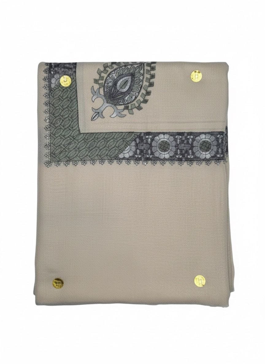 الملمس والمظهر: يتمتع الشال بمظهر ناعم ولامع قليلاً بفضل خامة الكشمير، مما يوحي بالجودة العالية. كما أن كثافة التطريز تخلق تبايناً جميلاً بين نعومة القماش وغنى الخيوط.
